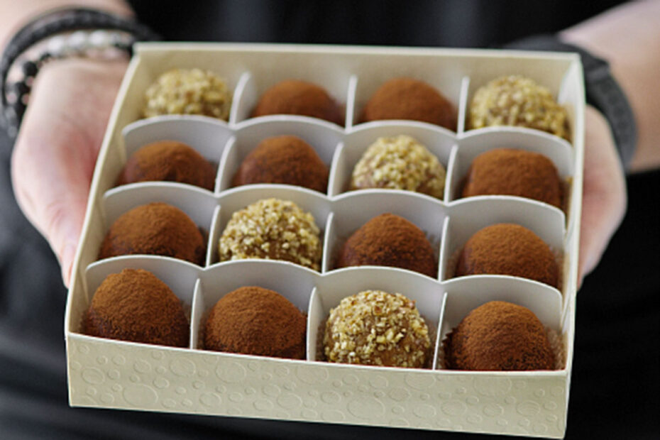 Potom z hmoty vytvarujeme guľôčky, ktoré obaľujeme v posýpke alebo kakau.